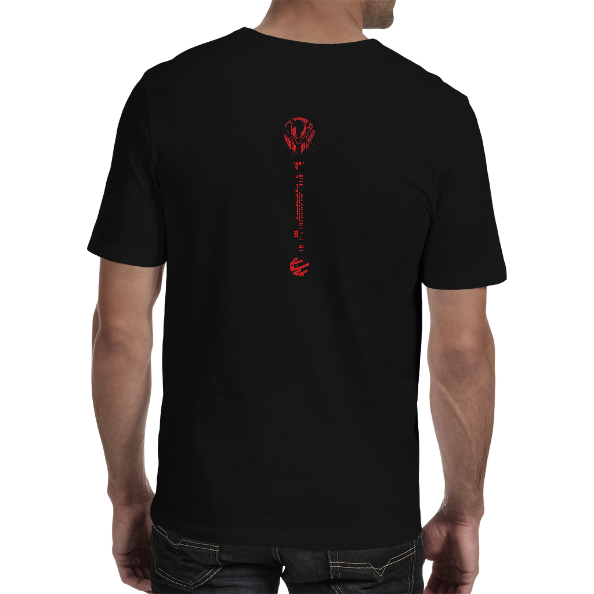 Fine combed 100% cotton, crewneck T-shirt, Design shows a bounty hunter's spacecraft on the front and an alien code string on the back.